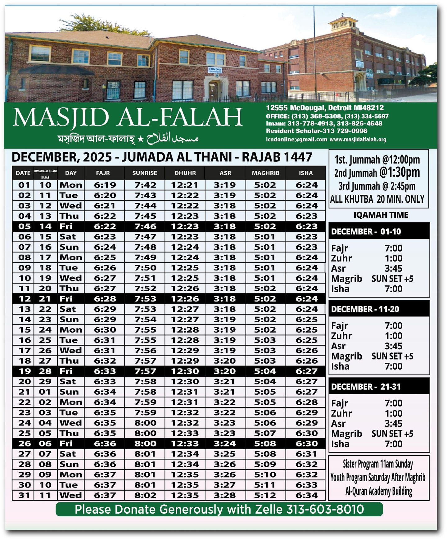 Masjid Al Falah is situated near Hamtramck, serving as one of the largest mosques in Detroit for our local community.
